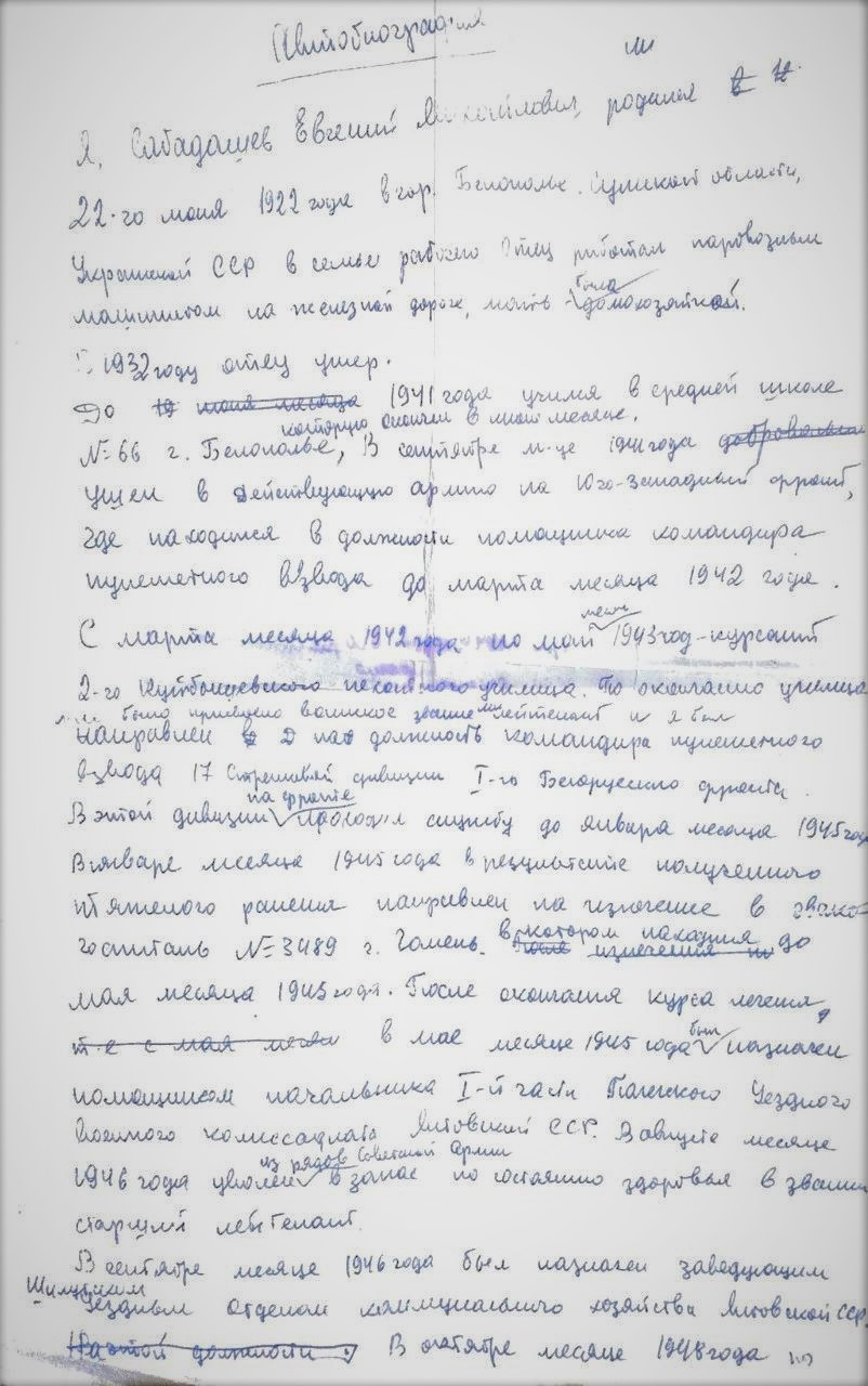 Сабадашев Евгений Михайлович родился 22-го июня 1922 года в городе Белополье, Сумской области, Украинской ССР в семье рабочего. Отец работал паровозным машинистом на железной дороге, мать была домохозяйкой.
